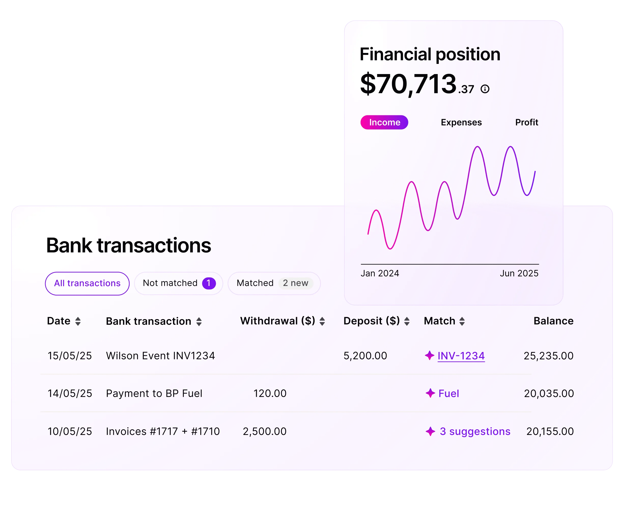 Bankfeeds connect your bank account to your accounting software, and automatically download all your transaction data to make balancing your books easy and seamless. Rather than combing through statements from your bank or financial institution and manually entering the details to keep track of your incomings and outgoings, information about all your transactions is available in your accounting software in real-time, making bank reconciliation a breeze.