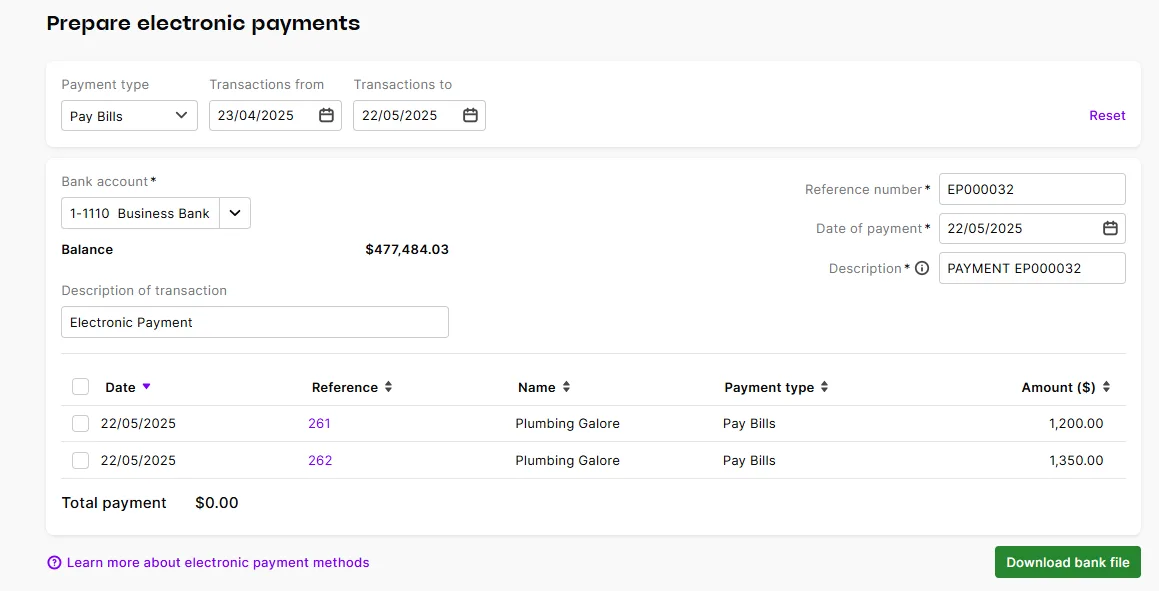 Supplier payments made through Pay bills or Spend money can be grouped into a single transaction using the Electronic payments feature. You'll first need to set up electronic payments, but this only takes a minute.