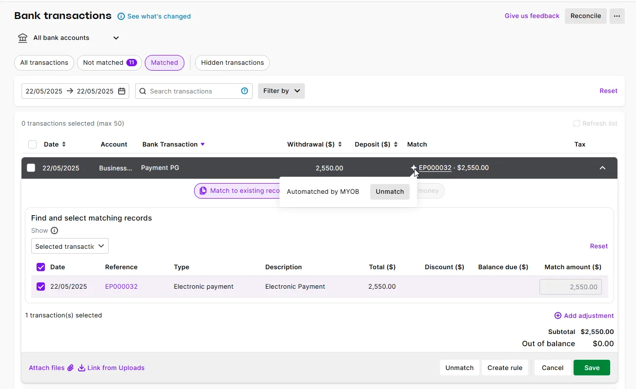 Now when you receive the bank feed, MYOB Business will match the withdrawal from your bank account for this bulk electronic payment, to the grouped electronic payment transaction record.