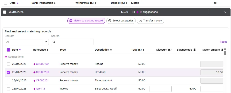 Of course, if there are two identical MYOB transaction records, a match won’t happen — you're able to review the suggested matches and select the right one: