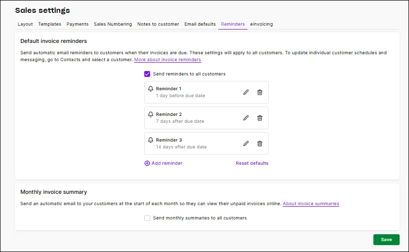 Default settings - Turn reminders on for customers and define a default schedule in your sales settings.