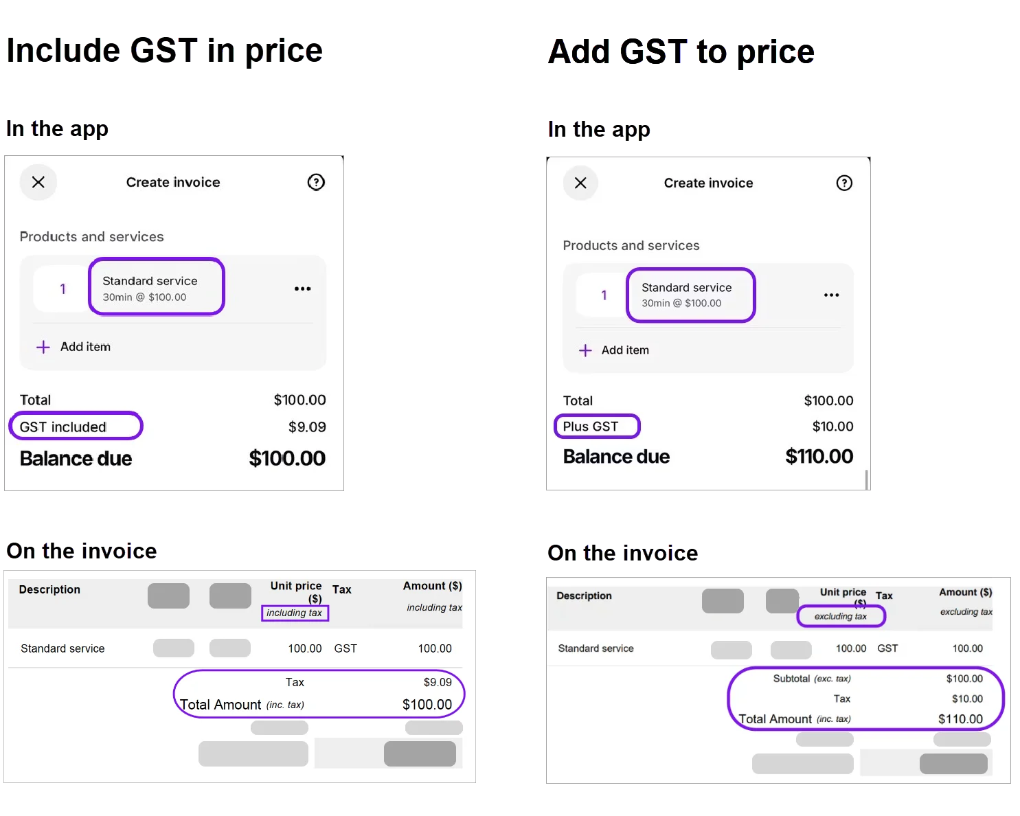 If you're registered for GST, you can choose how you enter the price of items (GST already included or added on top after). This is reflected in what appears on your invoice too. To change this setting: